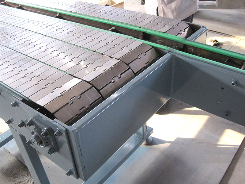 鏈板輸送機(jī)是一種以標(biāo)準(zhǔn)鏈板為承載面,由馬達(dá)減速機(jī)為動力傳動的傳送裝置。鏈板式輸送機(jī),由動力裝置(電機(jī))、傳動軸、滾筒、張緊裝置、鏈輪、鏈條、軸承、潤滑劑、鏈板等等構(gòu)成。其中帶動物料的輸送的主要的兩個部分為:鏈條,利用它的循環(huán)往復(fù)運(yùn)動提供牽引動力;金屬板,作為輸送過程中的承載體??梢酝ㄟ^多列鏈板并行,使鏈板輸送機(jī)做的很寬并形成差速,利用多列鏈板的速度差使多列輸送在無擠壓的情況下變?yōu)閱瘟休斔?,從而滿足飲料貼標(biāo)、灌裝、清洗等設(shè)備的單列輸送的要求,我們可以將兩條鏈板輸送機(jī)的頭尾部做成重疊式的混合鏈?zhǔn)沟闷浚ü蓿w處于動態(tài)過度狀態(tài),使輸送線上不滯留物料,可以滿足空瓶以及實(shí)瓶壓力和無壓力輸送。